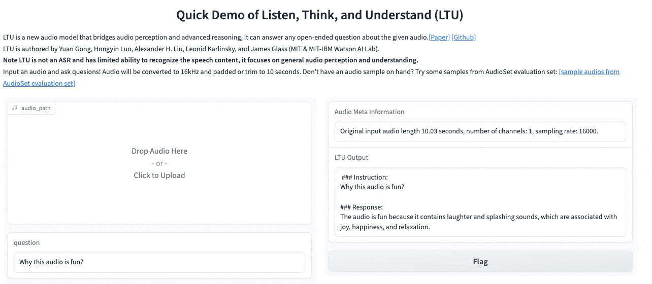 In this demo, you will be able to interact with LTU, our audio large language model that can jointly recognize, understand, and converse about any speech, paralinguistics (e.g., emotion) and general audio that it listens to.